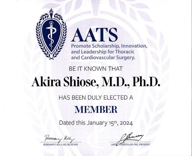 当科の塩瀬教授がAATS(The American Association for Thoracic Surgery)のMemberに選出されました。